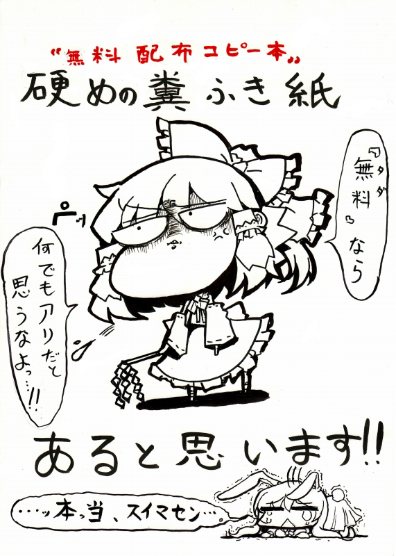 んでイベント参加情報。今週末開催の『こみっく☆トレジャー15』に参加します。自分はコミケで頒布した妖々夢本を持ってきます。あと、またろうくん書き下ろしのコピー本もあります。「コピー本の告知描いて☆」とお願いしたらこころよく描いてくれました。